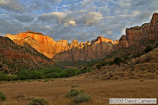 Sunrise. Here you can see (left to right) the West Temple (7810 ft), Sundial (7590 ft), & Altar of Sacrifice (7505 ft). For a daylight picture, see D4CE3005 |