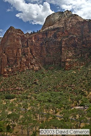 View across the valley from the Emerald Pools trail. You can see Zion Canyon Scenic Drive in the foreground & parts of the lodge in the lower right |