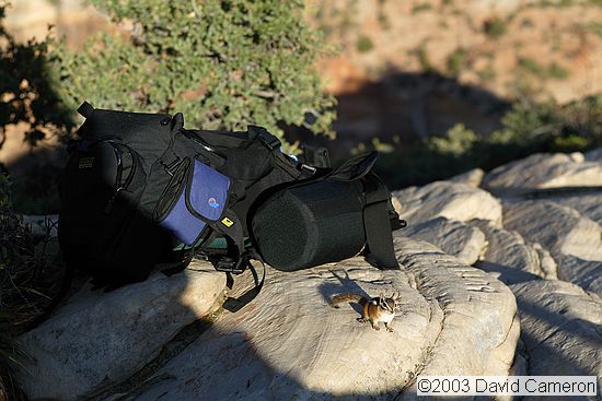 My 'friend' stakes a claim to my gear! It's hard to see it in this picture but that little guy is bearing his teeth & made a couple of lunges towards me. Luckily I still had my large tripod to fend him off! |