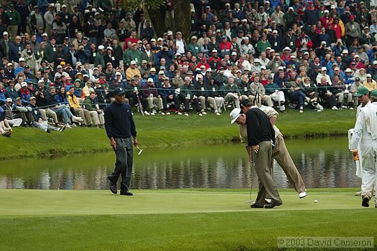 ![]() D4CE0890F Jay Haas looks for his ball in the hole after Tiger Woods snatched Jay's ball on the Par 3 9th green & put it in his pocket