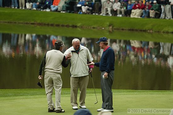 ![]() D4CE0986F Gary Player, Arnold Palmer, & Jack Nicklaus finish the Par 3 Tournament on the 9th green |