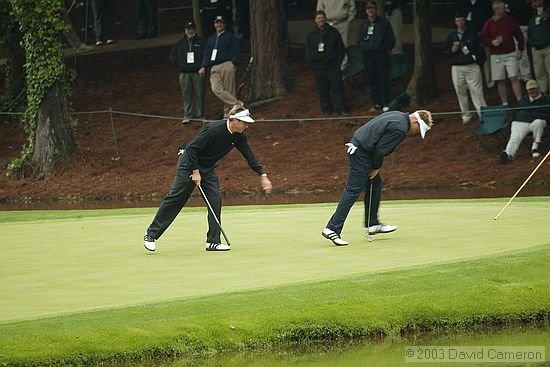 ![]() D4CE1021F Robert Allenby pushes Stuart Appleby on the Par 3 8th green |
