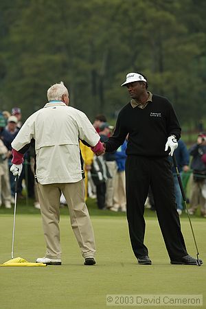 ![]() D4CE0851F Arnold Palmer & Vijay Singh on the 9th green after finishing the front 9 before the Par 3 Tournament Arnold won the 1958, 1960, 1962, & 1964 Masters Vijay won the 2000 Masters |