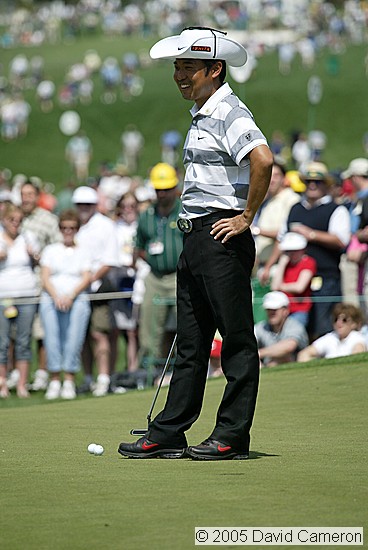 Shingo Katayama laughs as he watches his ball rolls off the 7th green |