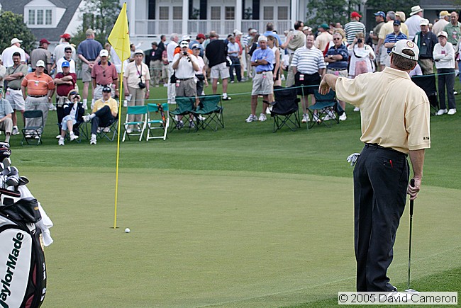 Fred Funk encourages his ball towards the hole on the 9th green