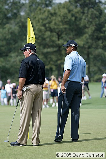 Mark O'Meara & Tiger Woods talk on the 17th green