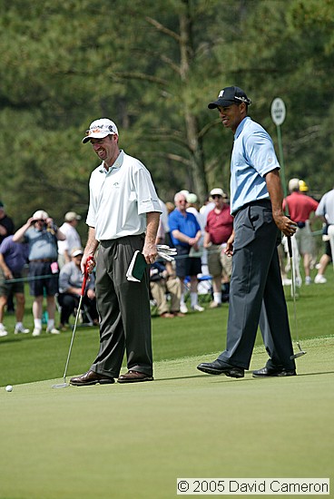 Tiger Woods & a player enjoy a laugh on the 17th green