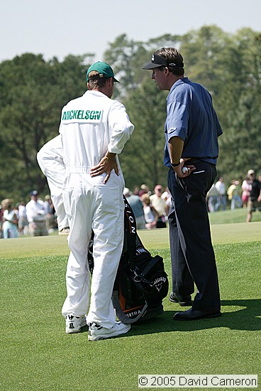 Phil Mickelson talks with his caddie on the 17th green