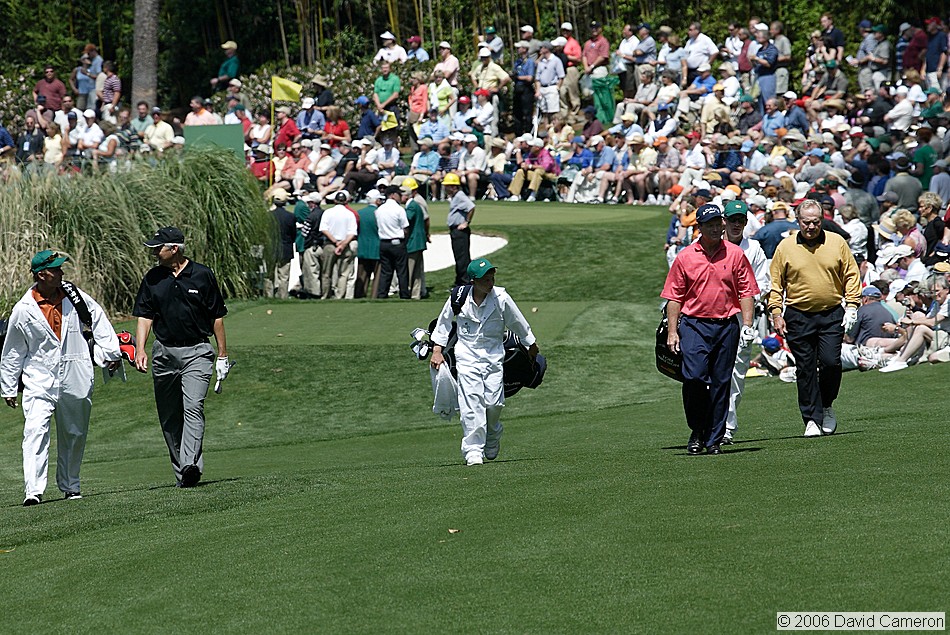 Jack Nicklaus (1963, 1965, 1966, 1972, 1975, & 1986 Masters Champion), Tom Watson (1977 & 1981 Masters Champion), & Andy North approach the Par 3 5th green |