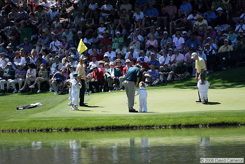 Phil Mickelson (2004 & 2006 Masters Champion) helps his daughter with her putt on the Par 3 9th green |