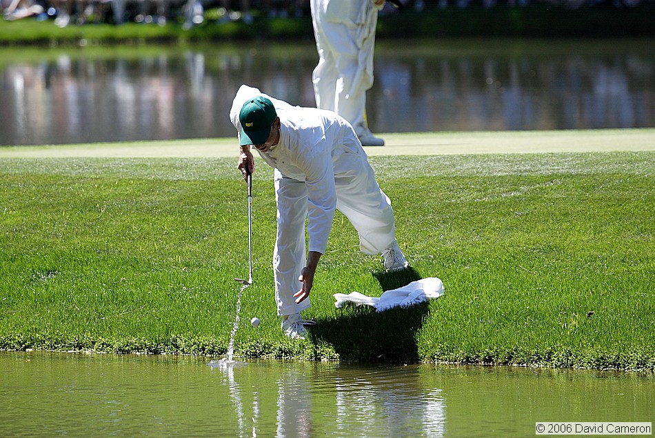 A caddy fetches a ball out of the water on the Par 3 8th hole