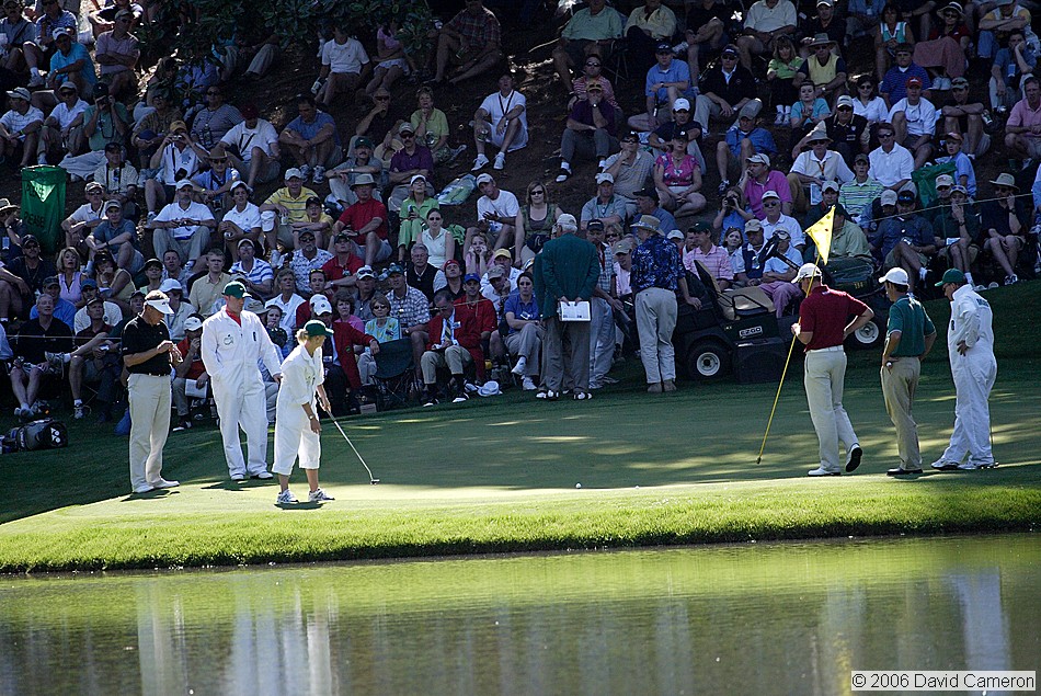 Henrik Stenson's caddie putts on the Par 3 9th hole |