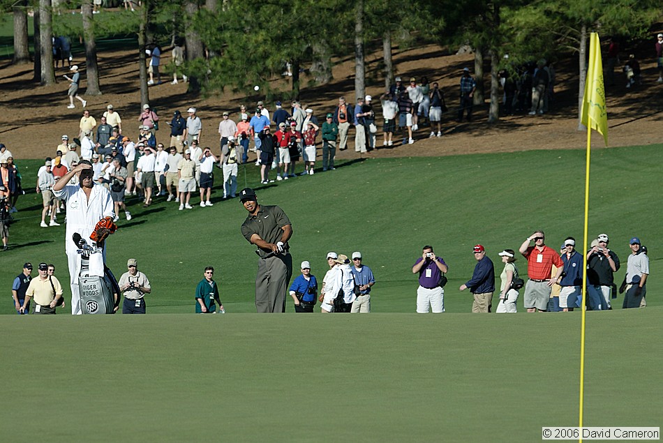 Tiger Woods (1997, 2001, 2002, & 2005 Masters Champion) chips onto the 9th green |