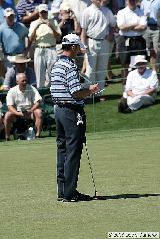 Mike Weir (2003 Masters Champion) takes notes on the 18th green