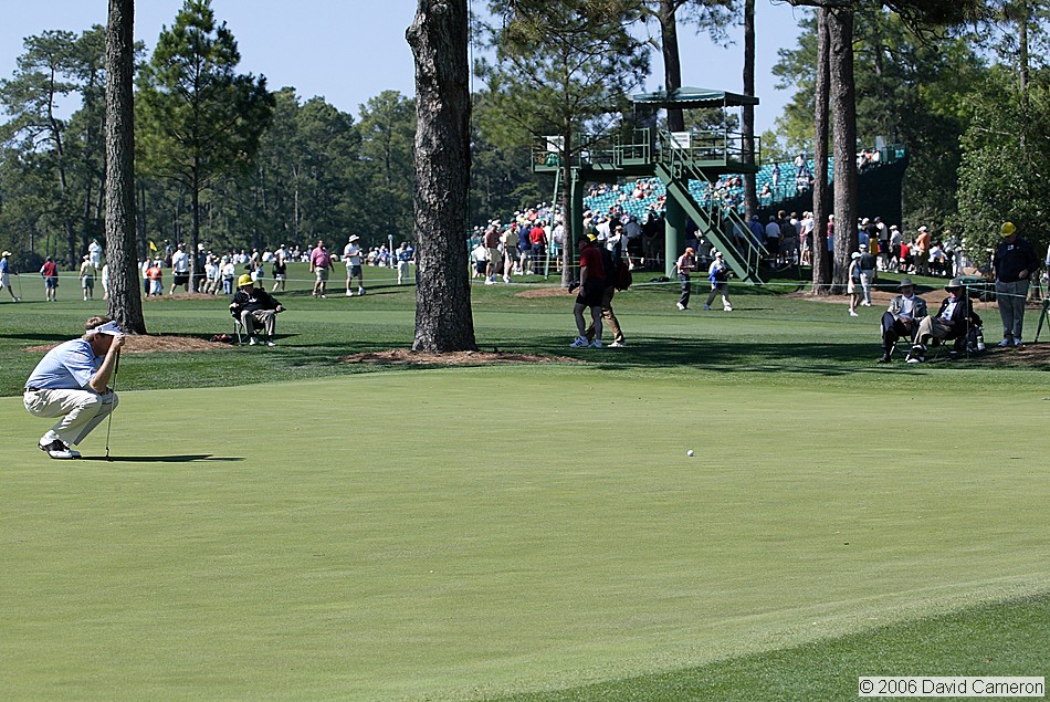 Davis Love III examines the 14th green