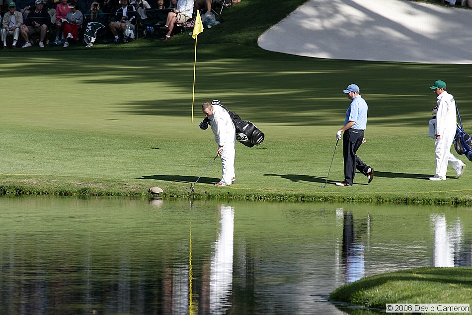 Caddie fetches a ball from the water on #16