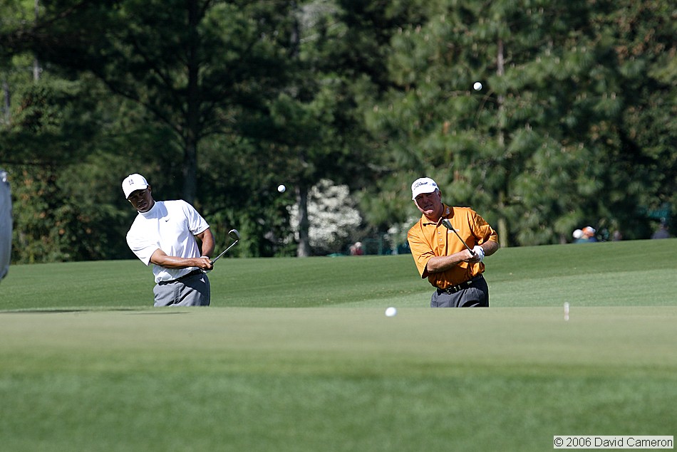 Mark O'Meara (1998 Masters Champion) & Tiger Woods (1997, 2001, 2002, & 2005 Masters Champion) chip onto the 17th green |